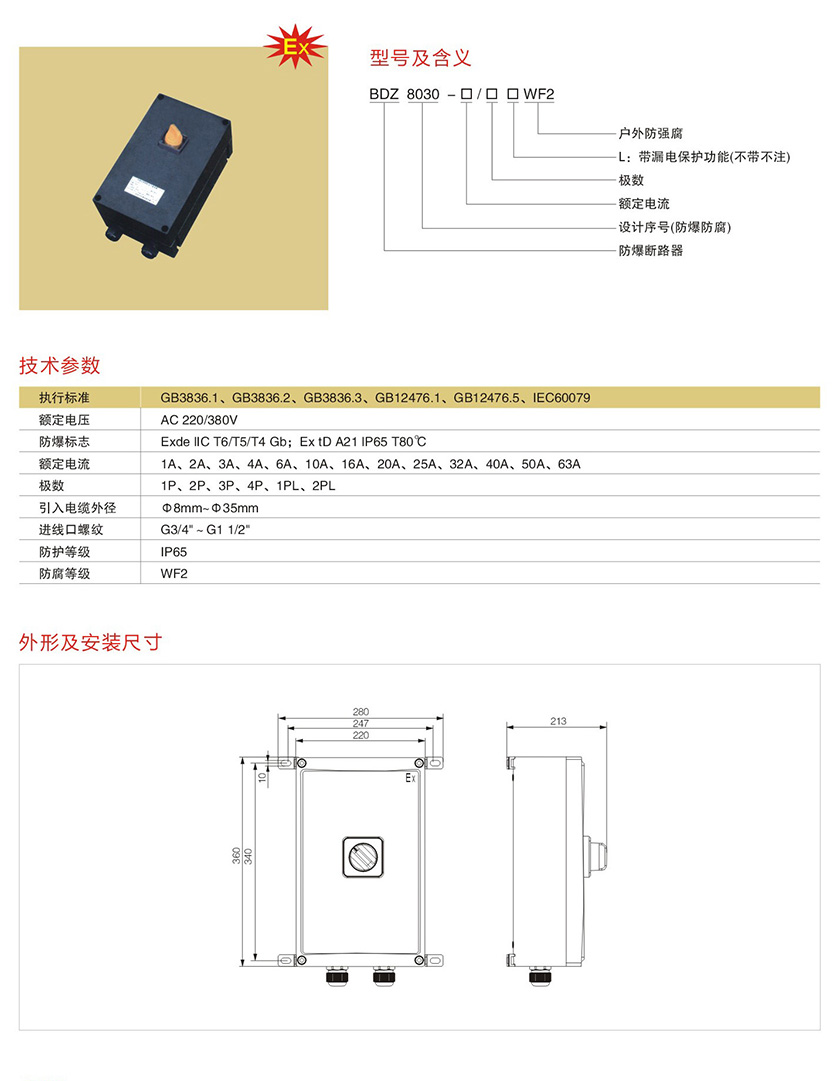 产品中心 防爆配电箱、电器管件类 BDZ8030系列防爆防腐断路器(IIB、IIC)